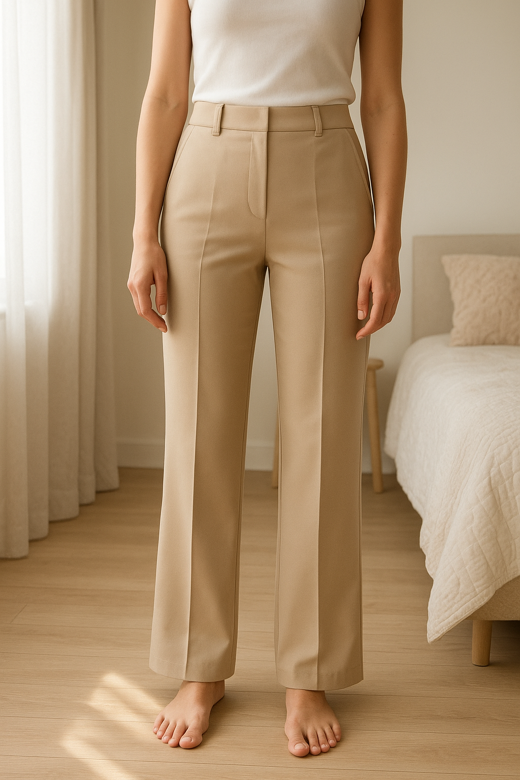 Pantalon beige patte d’éléphant debout, face à la caméra, dans une chambre à la lumière douce, avec une lumière naturelle filtrant par la fenêtre.