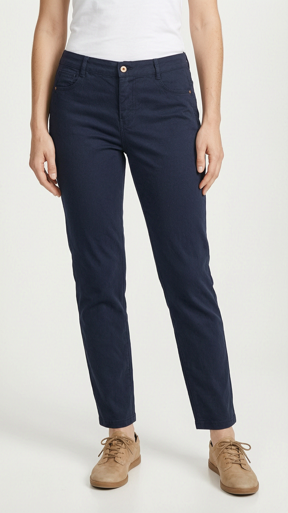 Une personne en Pantalon bleu marine, Marque Camaieu, taille 40 cambrant légèrement le dos pour une pose dynamique, dans un studio photo épuré avec fond blanc et éclairage doux.