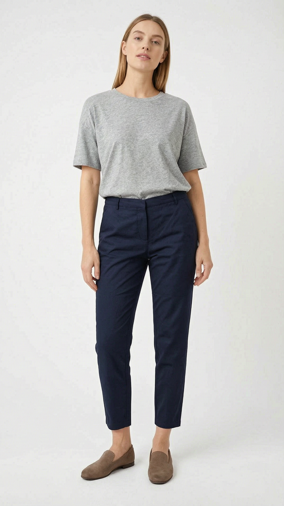Une personne en Pantalon bleu marine, Marque Kiabi, taille 38 cambrant légèrement le dos pour une pose dynamique, dans un studio photo épuré avec fond blanc et éclairage doux.