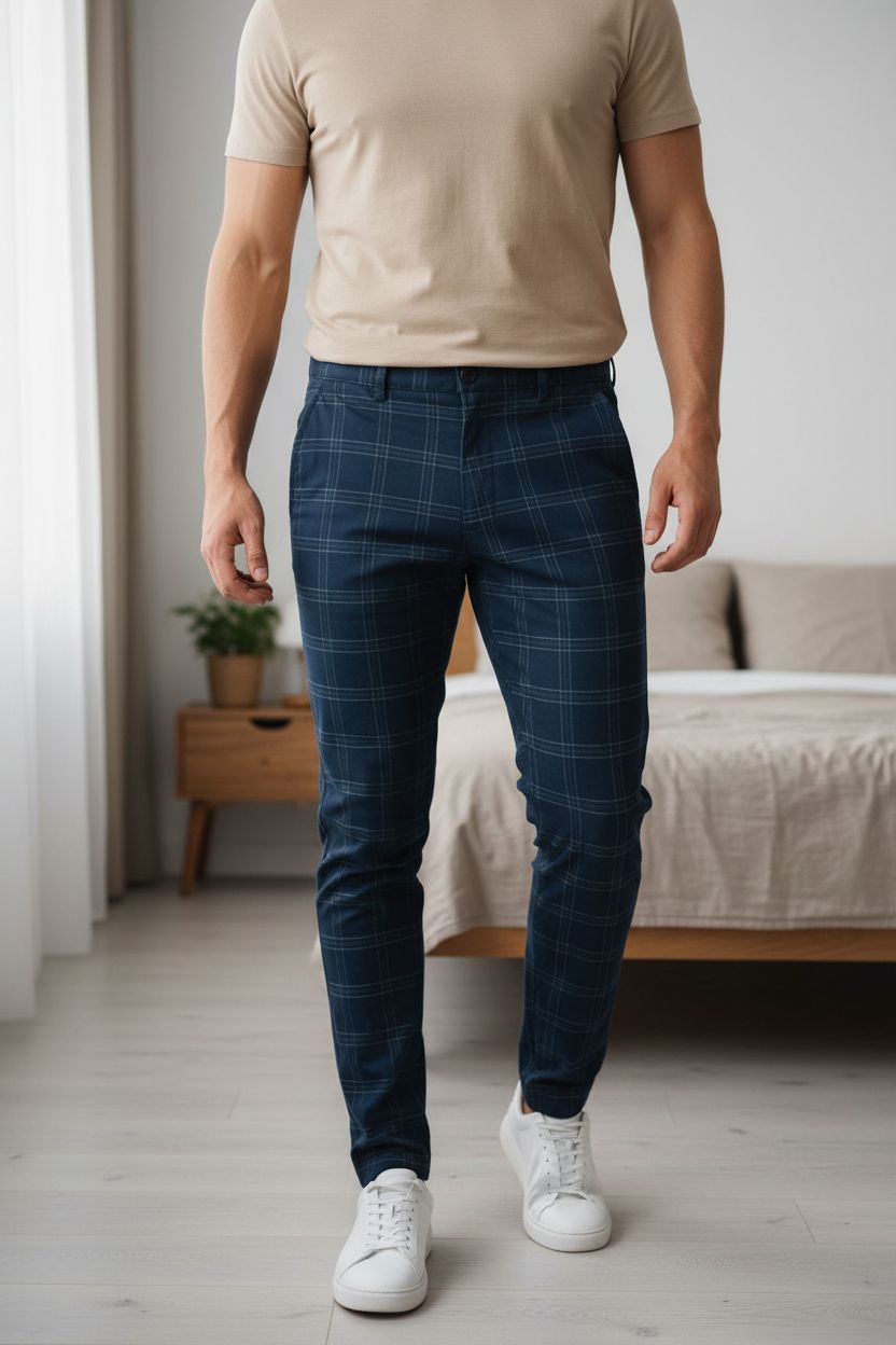 Pantalon chino Zara 38 a carreaux coupe ajustée elegante debout, face à la caméra, dans une chambre à la lumière douce, avec une lumière naturelle filtrant par la fenêtre.