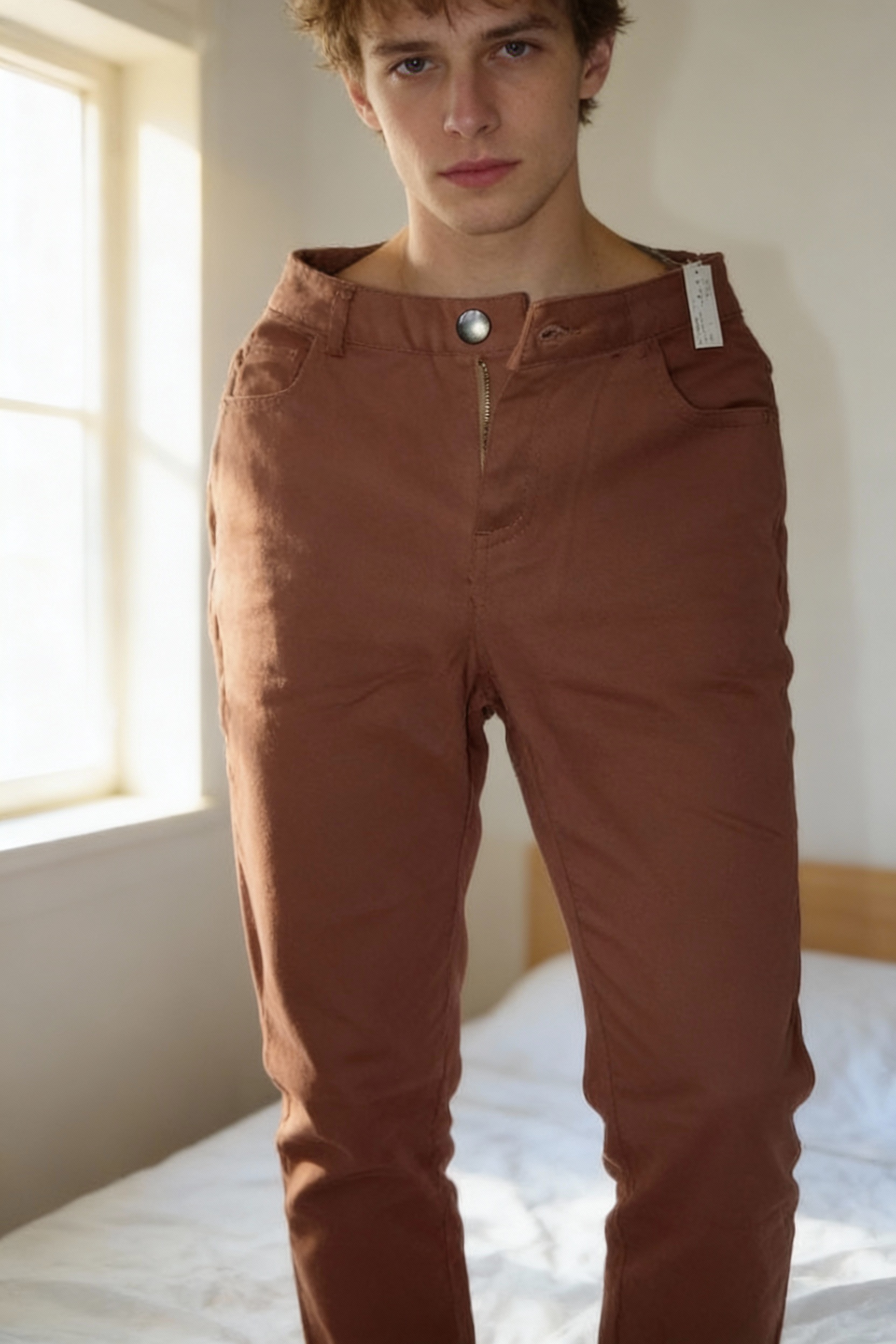 Pantalon coton neuf T40 debout, face à la caméra, dans une chambre à la lumière douce, avec une lumière naturelle filtrant par la fenêtre.