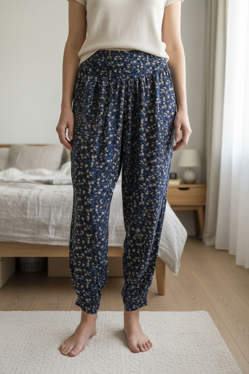 Pantalon d’été ample bleu marine et taupe taille M/L debout, face à la caméra, dans une chambre à la lumière douce, avec une lumière naturelle filtrant par la fenêtre.