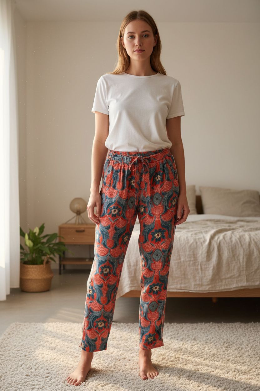 Pantalon d’été orange et bleu taille 38 debout, face à la caméra, dans une chambre à la lumière douce, avec une lumière naturelle filtrant par la fenêtre.