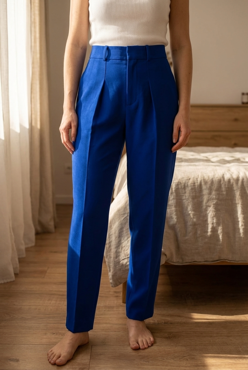 Pantalon de costume bleu Zara taille S debout, face à la caméra, dans une chambre à la lumière douce, avec une lumière naturelle filtrant par la fenêtre.