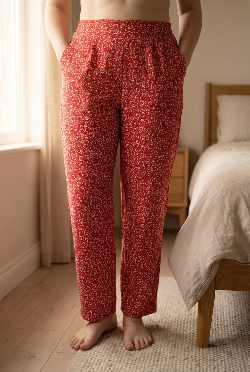 Pantalon fleuri rouge taille 38 debout, face à la caméra, dans une chambre à la lumière douce, avec une lumière naturelle filtrant par la fenêtre.