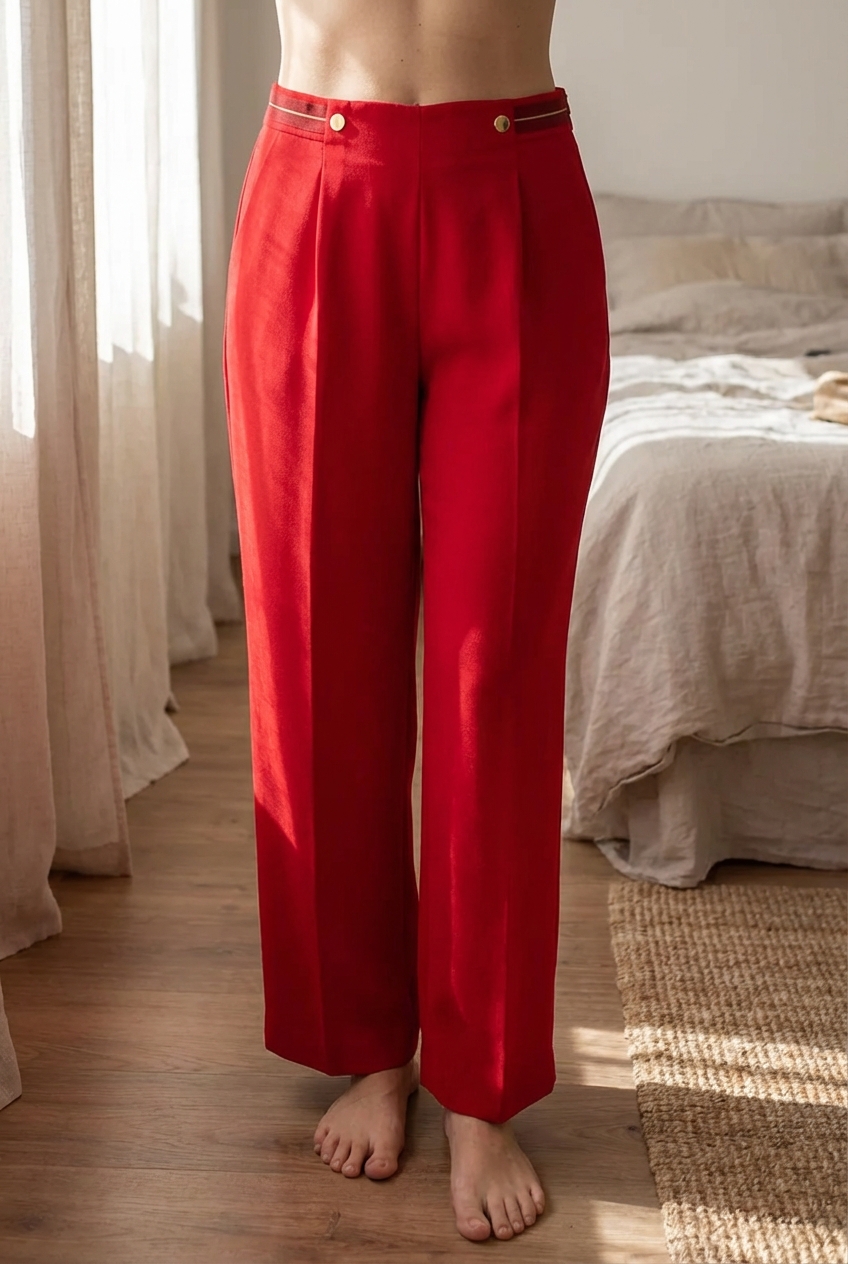 Pantalon fluide One Step debout, face à la caméra, dans une chambre à la lumière douce, avec une lumière naturelle filtrant par la fenêtre.
