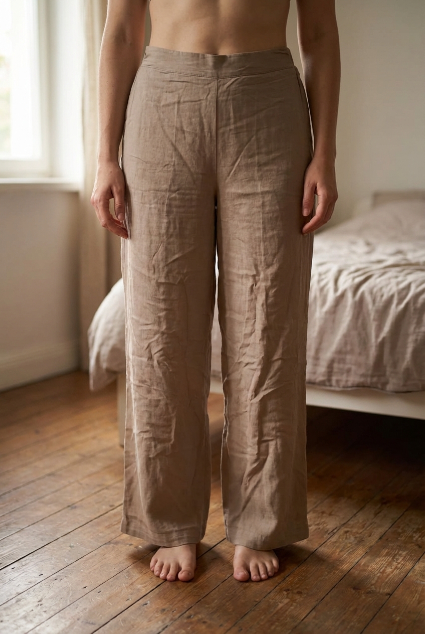 Pantalon fluide Zara debout, face à la caméra, dans une chambre à la lumière douce, avec une lumière naturelle filtrant par la fenêtre.