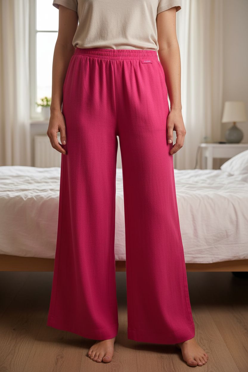 Pantalon fuchsia été Aveloria debout, face à la caméra, dans une chambre à la lumière douce, avec une lumière naturelle filtrant par la fenêtre.