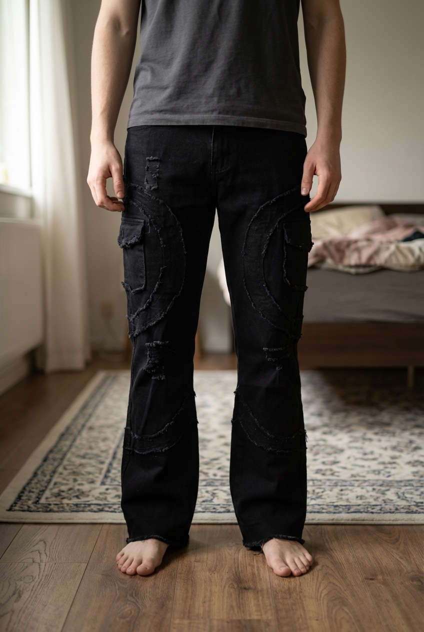 Pantalon sans marque style décontracté debout, face à la caméra, dans une chambre à la lumière douce, avec une lumière naturelle filtrant par la fenêtre.