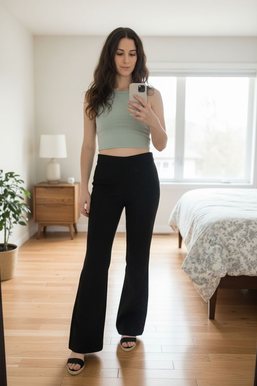 Pantalon tailleur évasé debout, face à la caméra, dans une chambre à la lumière douce, avec une lumière naturelle filtrant par la fenêtre.