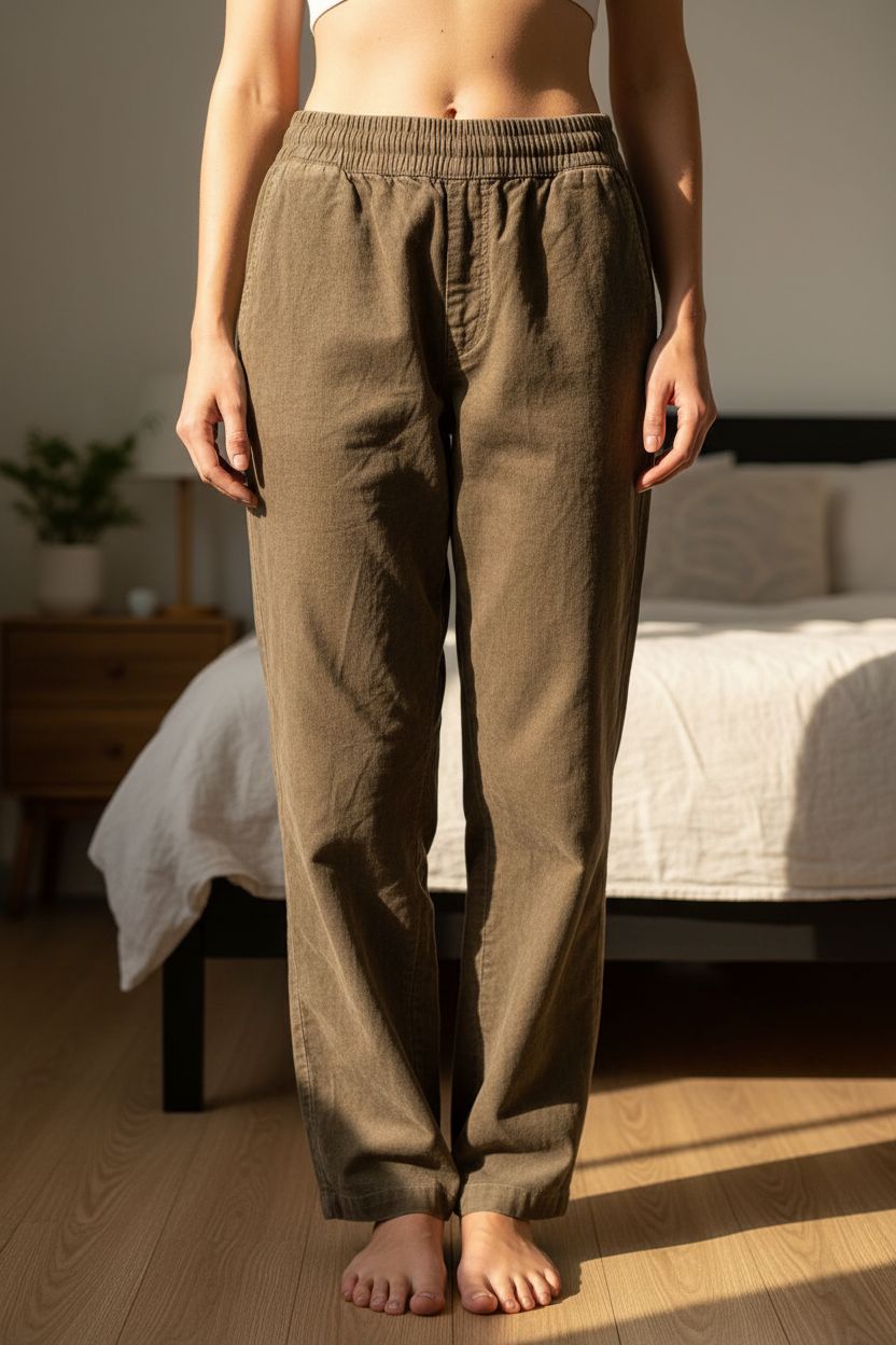 Pantalon velours kaki uniqlo debout, face à la caméra, dans une chambre à la lumière douce, avec une lumière naturelle filtrant par la fenêtre.