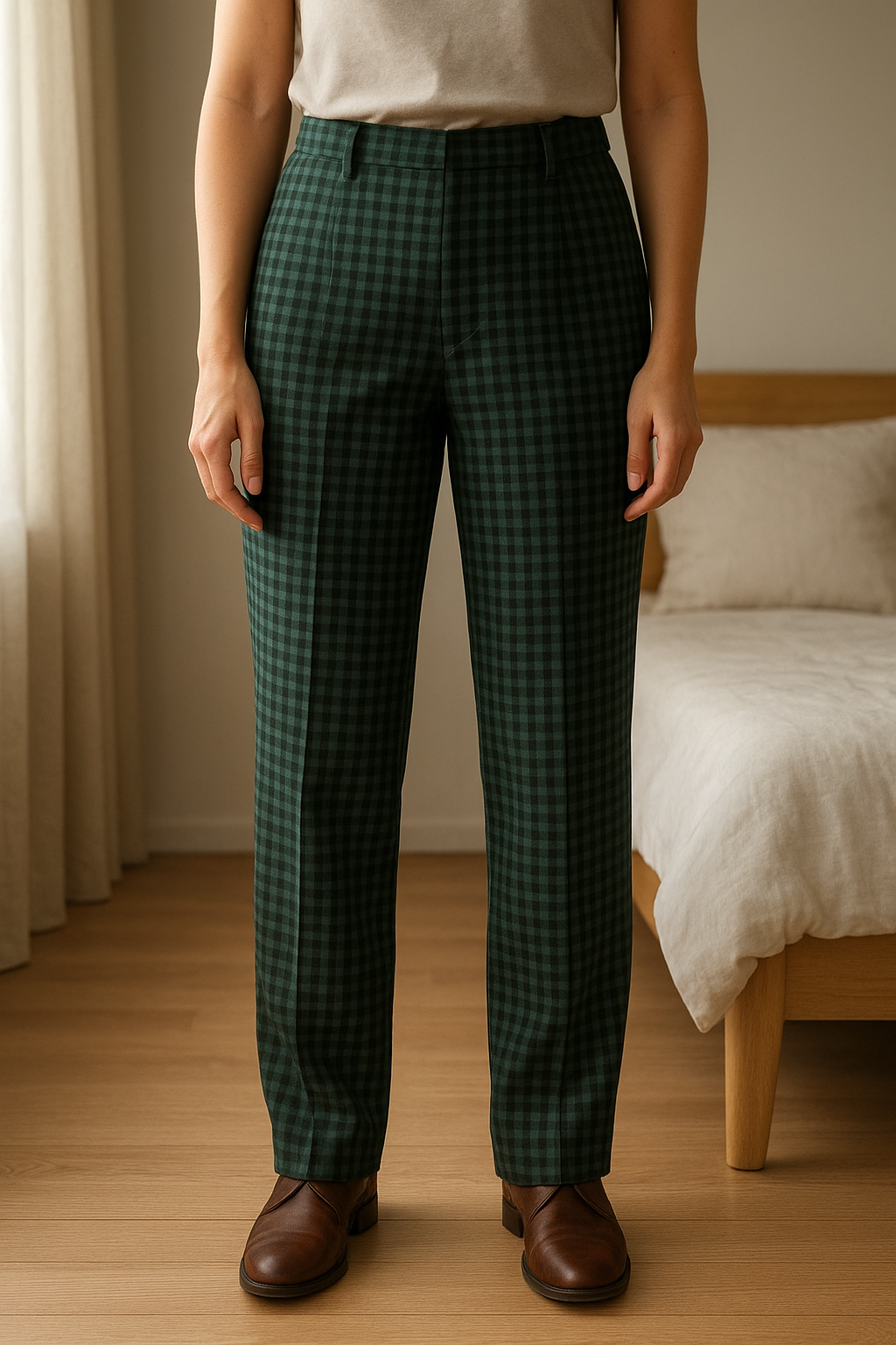 Pantalon Vichy debout, face à la caméra, dans une chambre à la lumière douce, avec une lumière naturelle filtrant par la fenêtre.