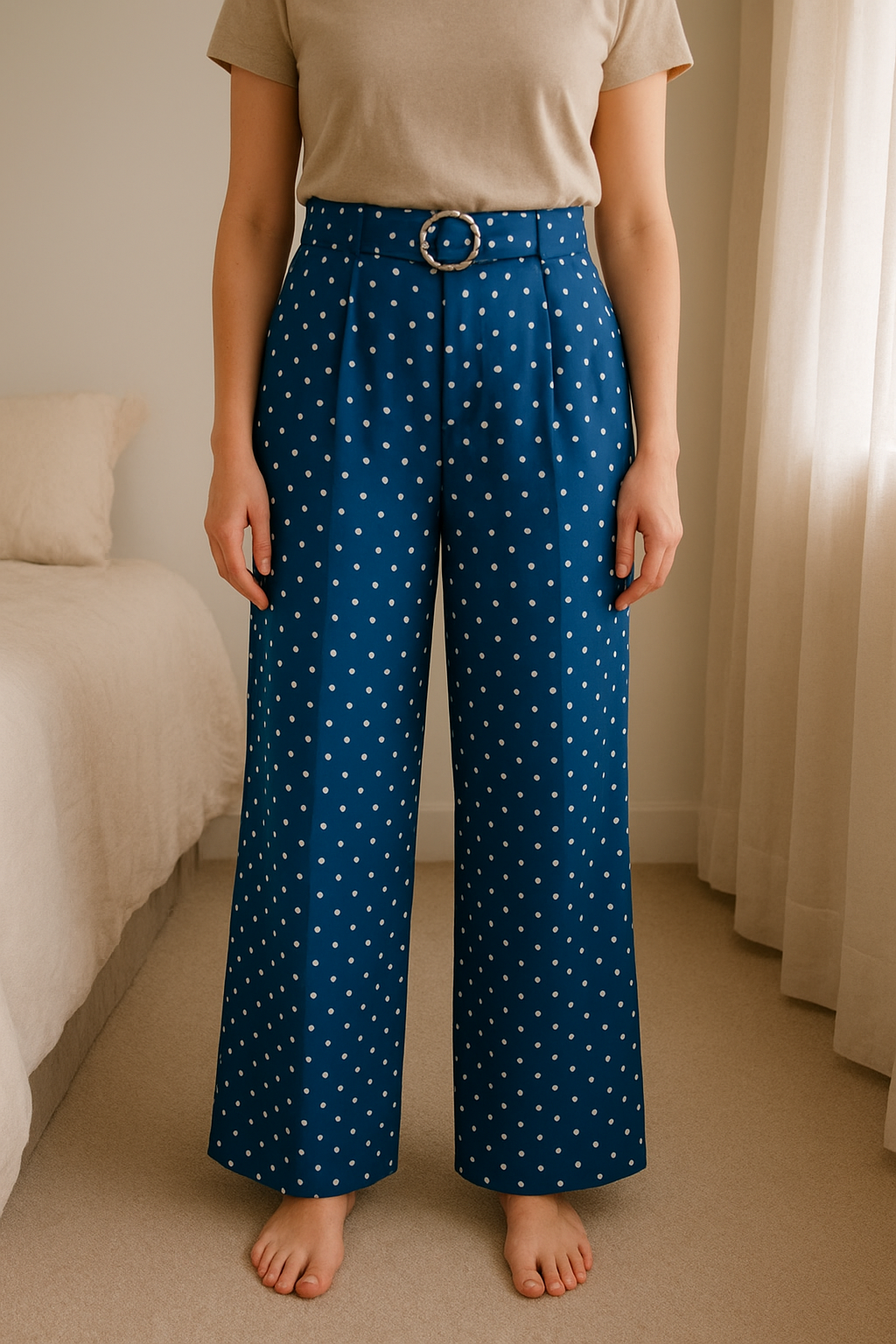 Pantalones anchos lunares H&M de pie, mirando a la cámara, en un dormitorio con luz suave y natural filtrándose por la ventana.
