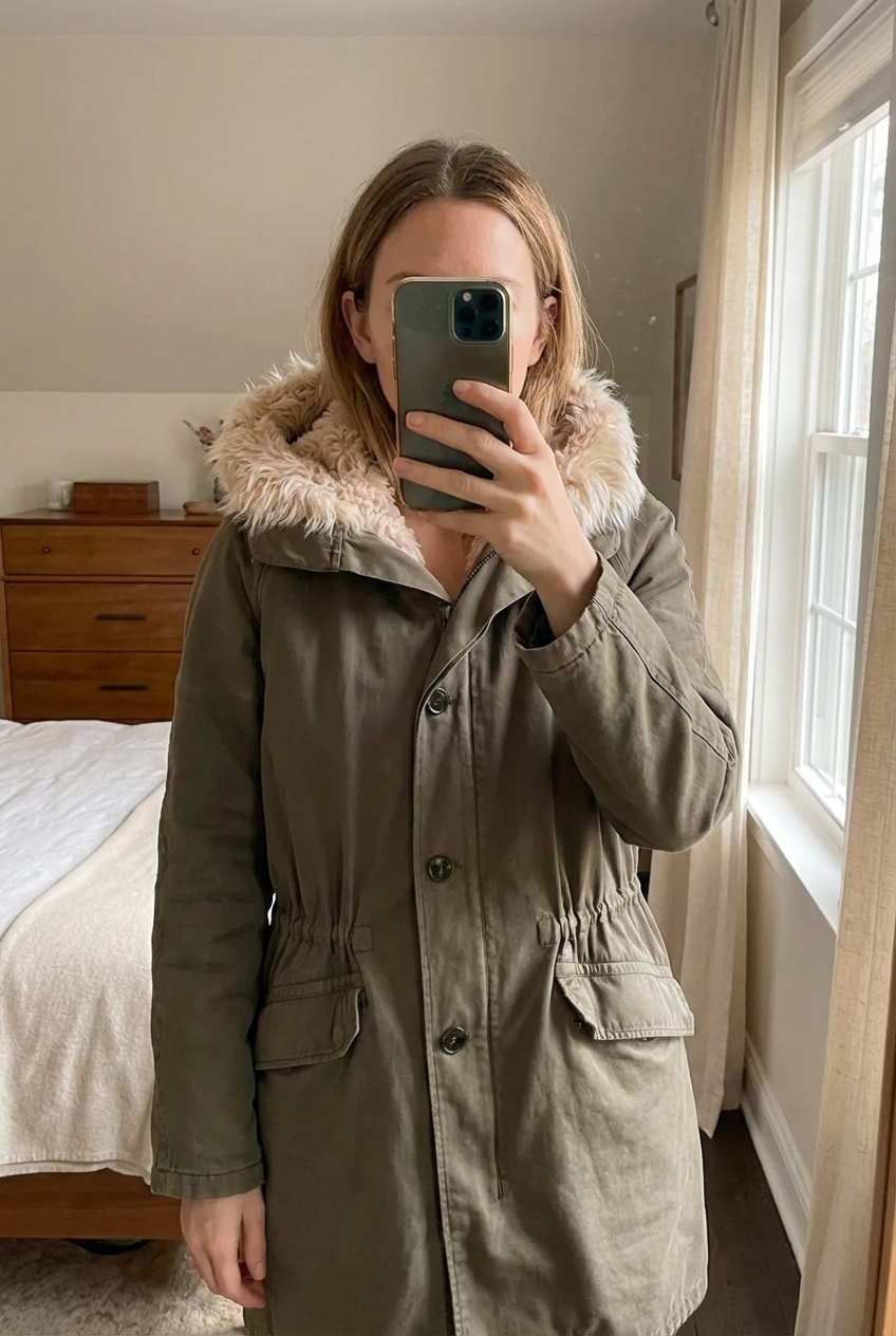 🧥 Parka femme Yves Salomon – Ligne ARMY – Taille L debout, face à la caméra, dans une chambre à la lumière douce, avec une lumière naturelle filtrant par la fenêtre.