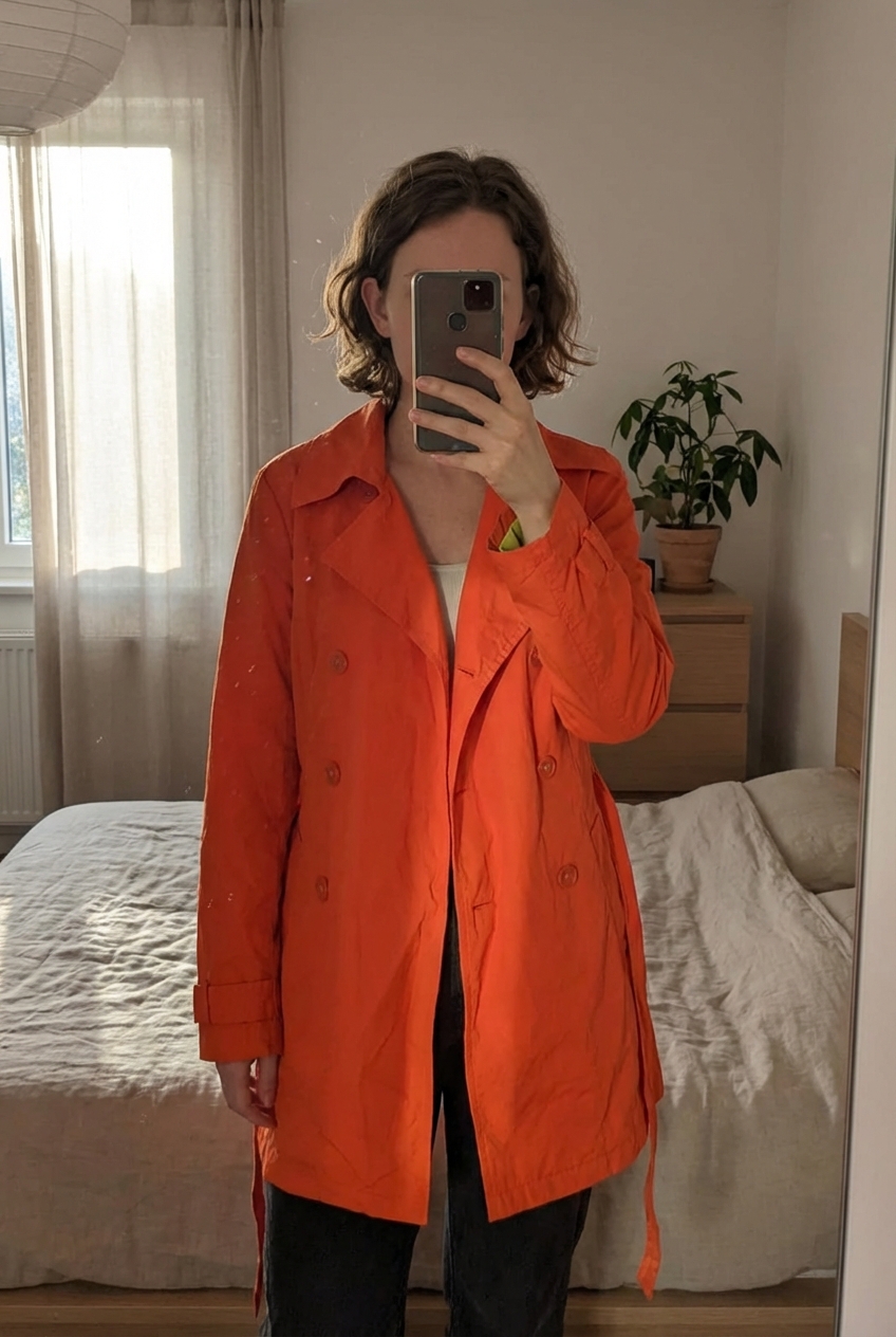 Parka Veste Orange 🍊 debout, face à la caméra, dans une chambre à la lumière douce, avec une lumière naturelle filtrant par la fenêtre.