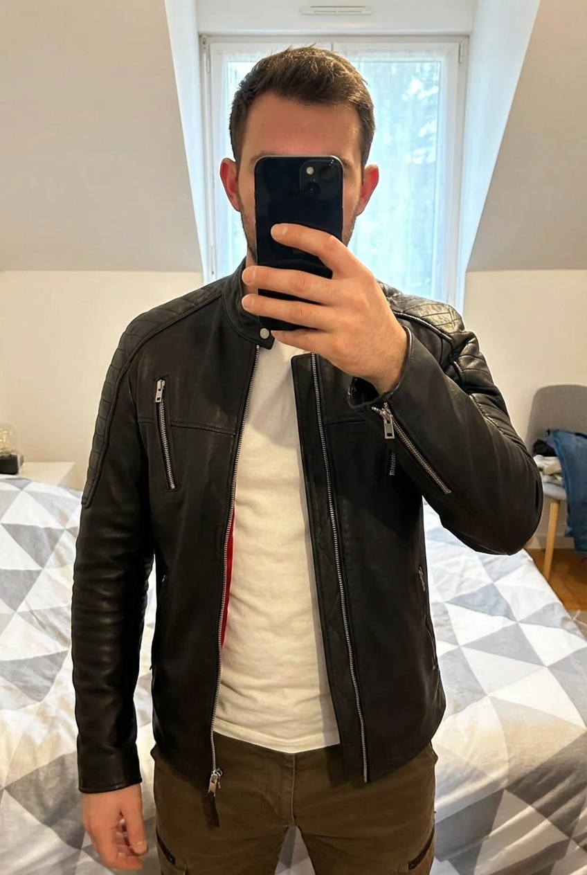 Perfecto Replay debout, face à la caméra, dans une chambre à la lumière douce, avec une lumière naturelle filtrant par la fenêtre.