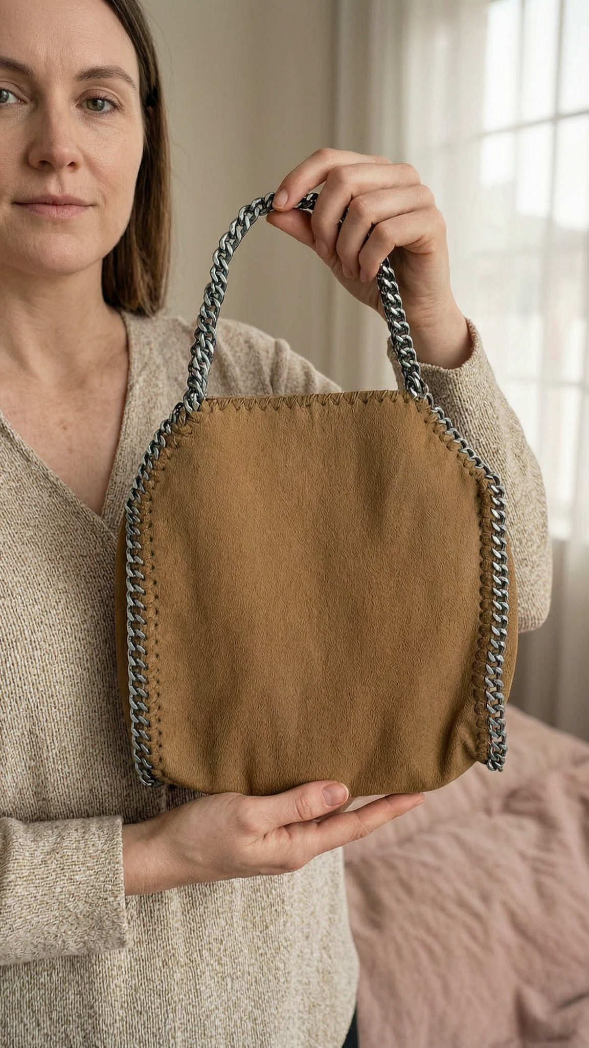 🤎 Petit sac à main marron debout, face à la caméra, dans une chambre à la lumière douce, avec une lumière naturelle filtrant par la fenêtre.