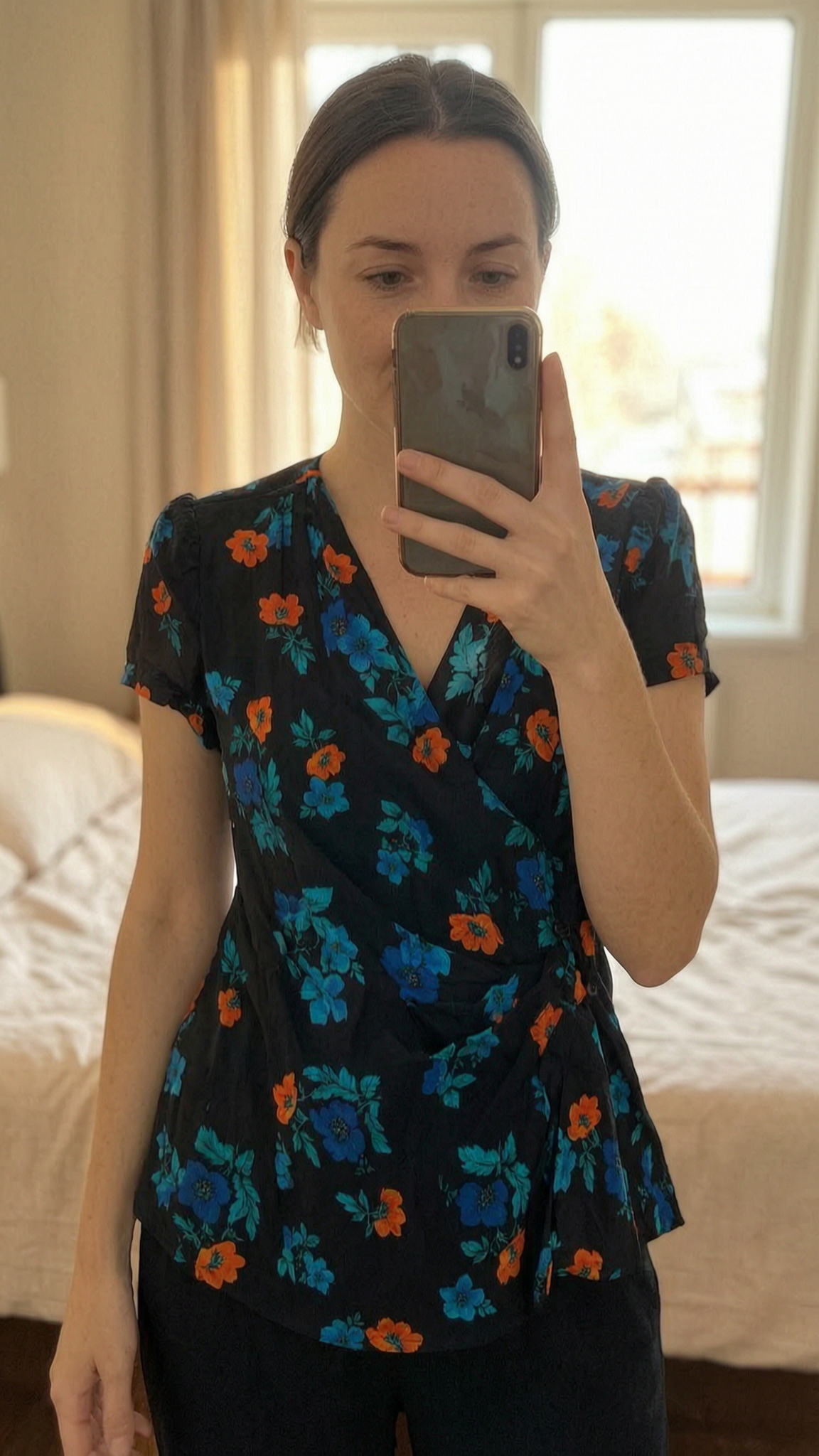 Petite blouse style porte-feuille debout, face à la caméra, dans une chambre à la lumière douce, avec une lumière naturelle filtrant par la fenêtre.