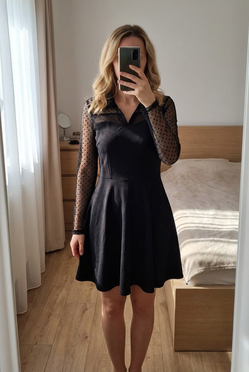 Petite robe noire plumetis taille 34 neuve debout, face à la caméra, dans une chambre à la lumière douce, avec une lumière naturelle filtrant par la fenêtre.
