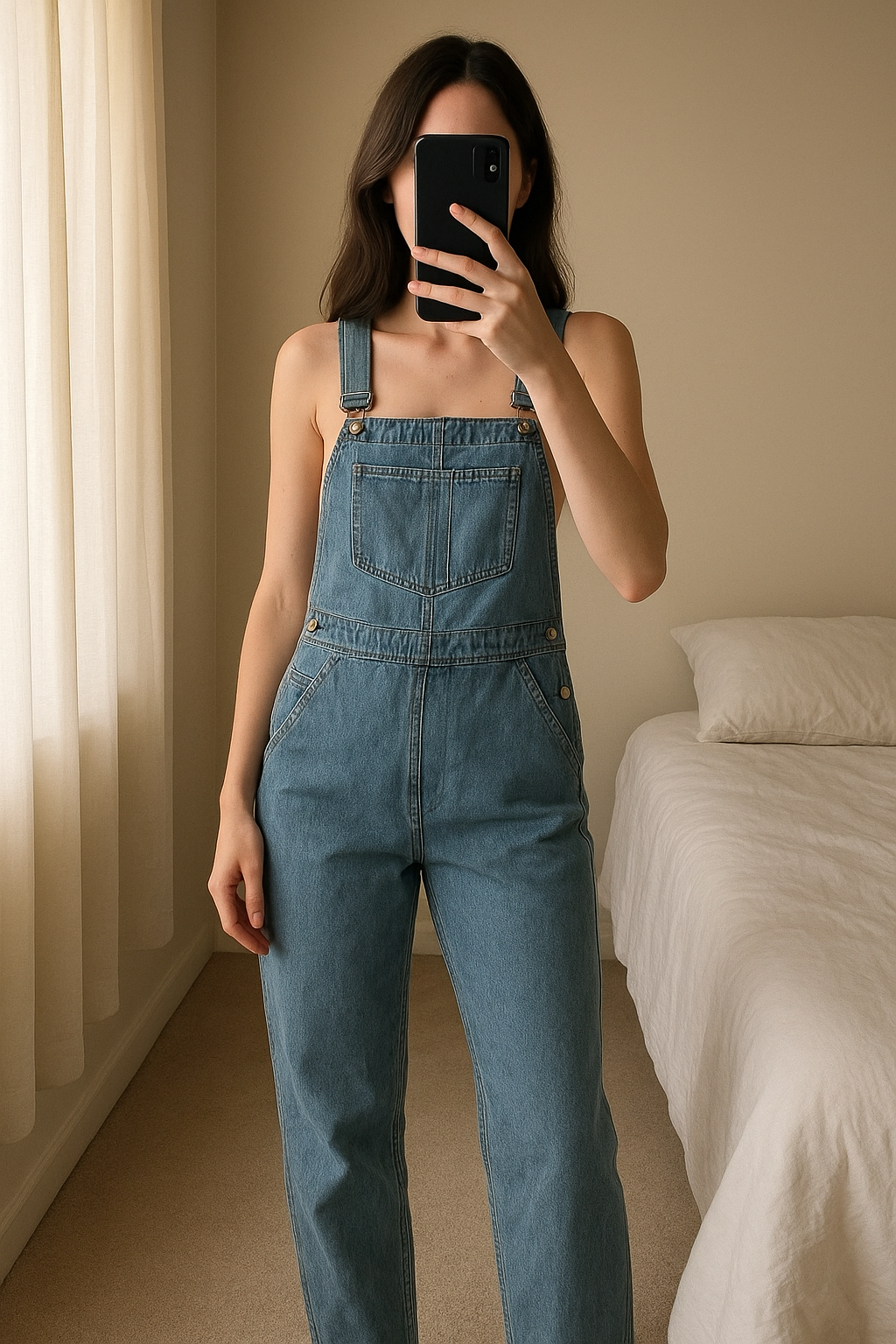 Una persona con Peto vaquero arqueando ligeramente la espalda para una pose dinámica, con tipo de cuerpo delgado, en un dormitorio con luz suave y natural filtrándose por la ventana.