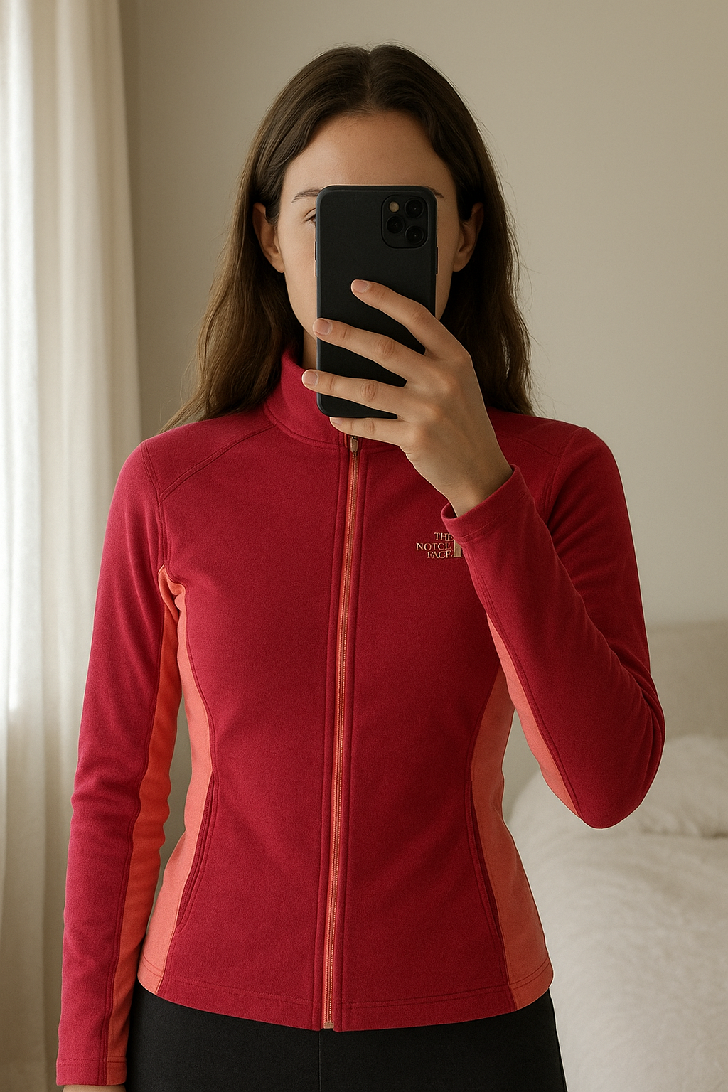 Polaire the north face rouge femme taille L debout, face à la caméra, dans une chambre à la lumière douce, avec une lumière naturelle filtrant par la fenêtre.