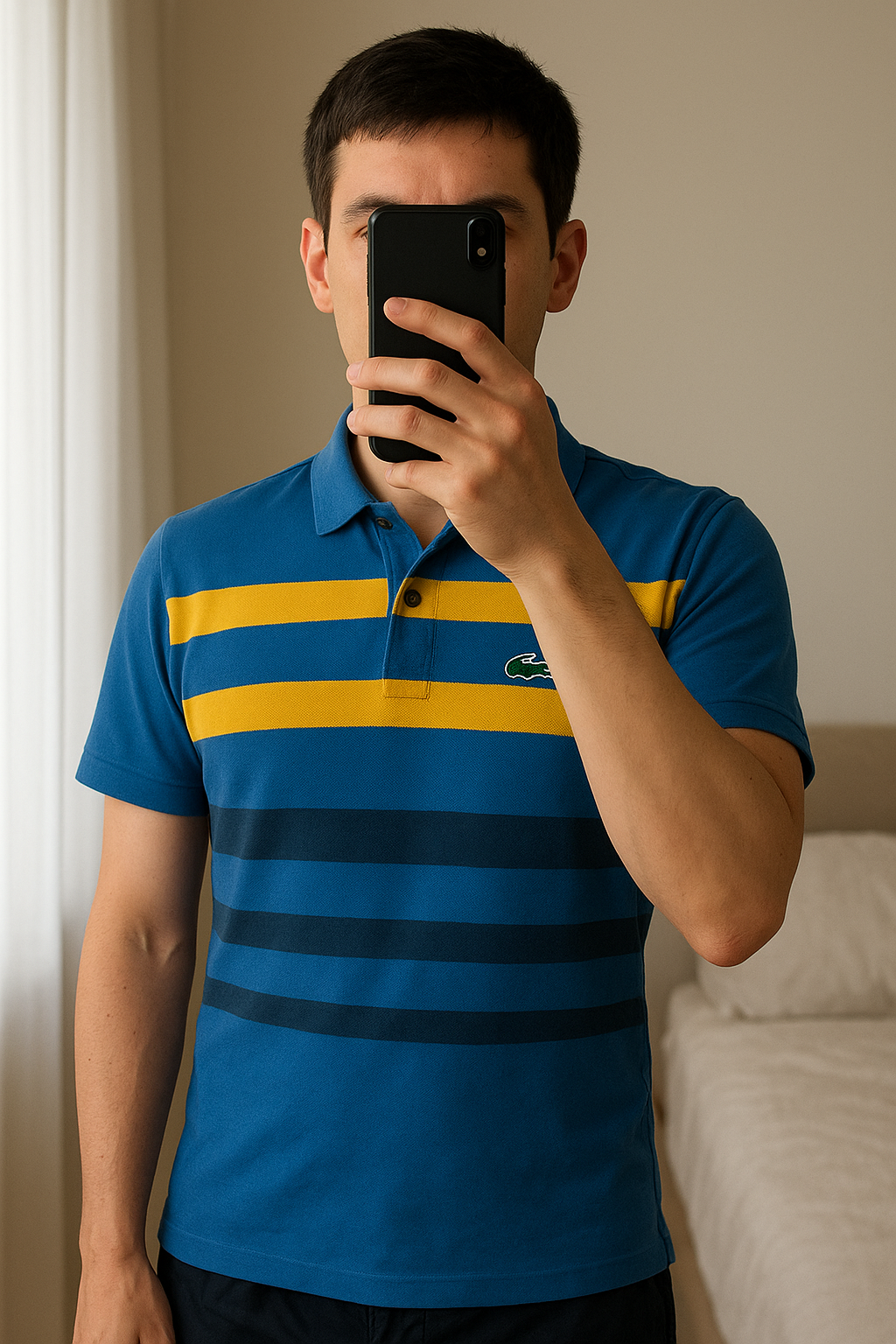 Poli Lacoste à rayures Homme debout, face à la caméra, dans une chambre à la lumière douce, avec une lumière naturelle filtrant par la fenêtre.