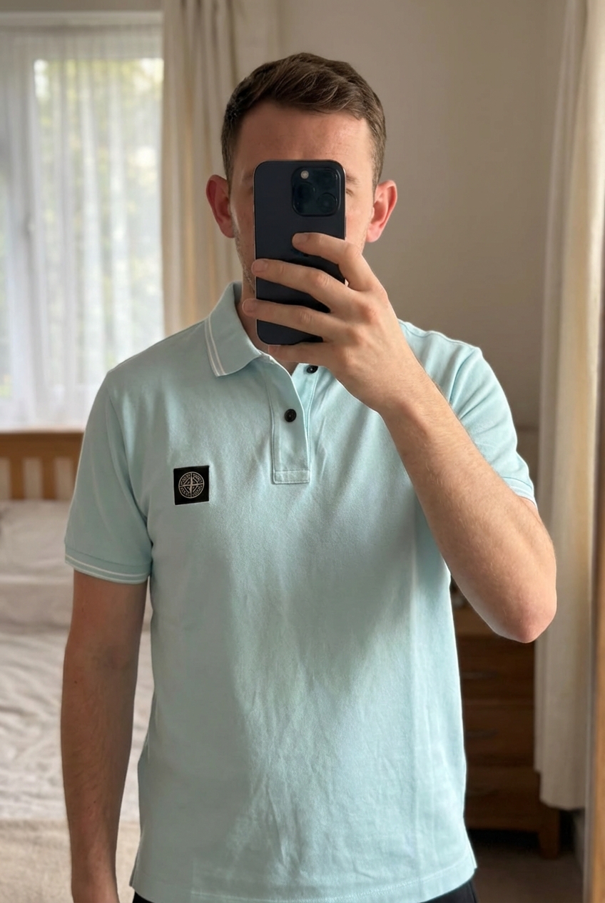 Polo bleu Stone Island Slim Fit Taille L debout, face à la caméra, dans une chambre à la lumière douce, avec une lumière naturelle filtrant par la fenêtre.