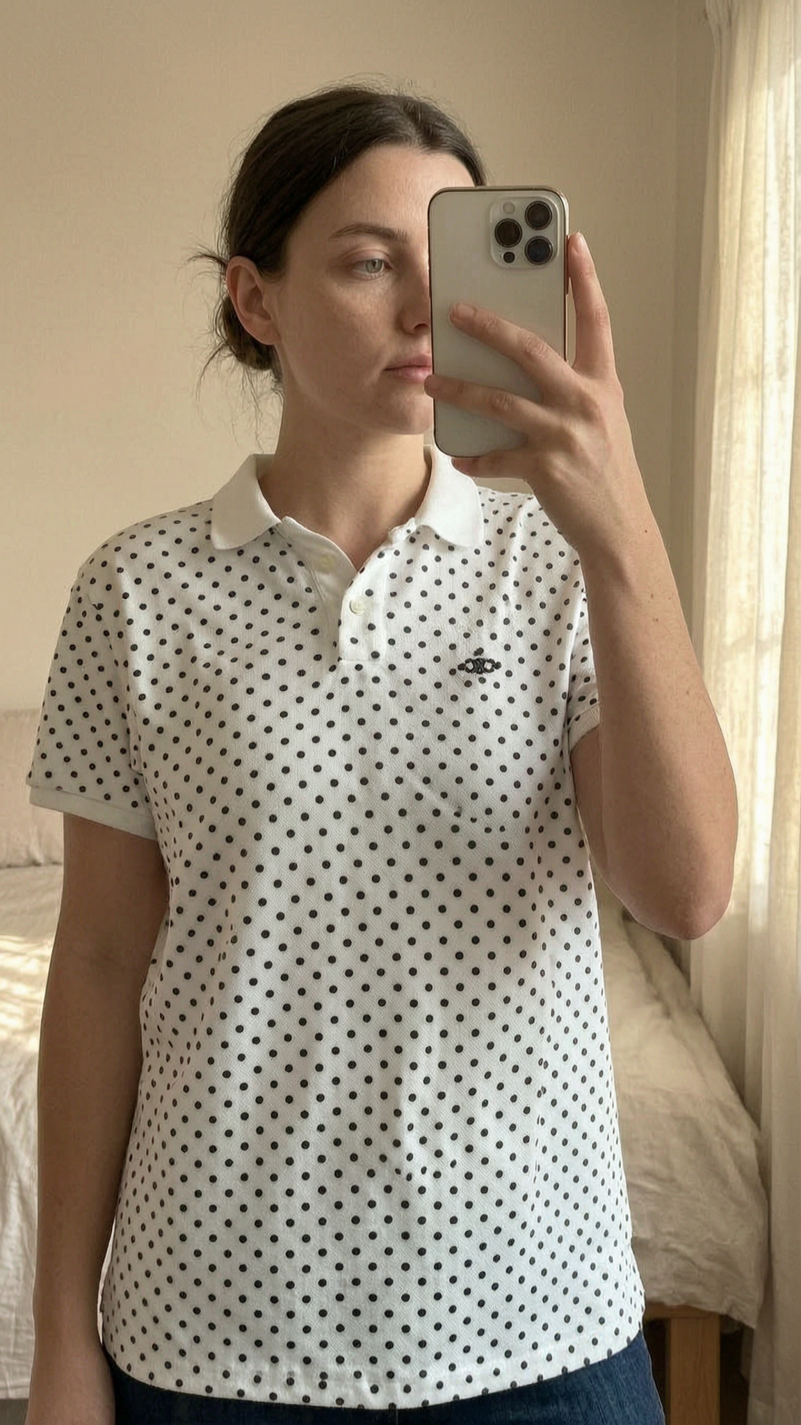 Une personne en Polo CELINE en coton piqué motif à pois XL cambrant légèrement le dos pour une pose dynamique, avec une silhouette fine, dans une chambre à la lumière douce, avec une lumière naturelle filtrant par la fenêtre.