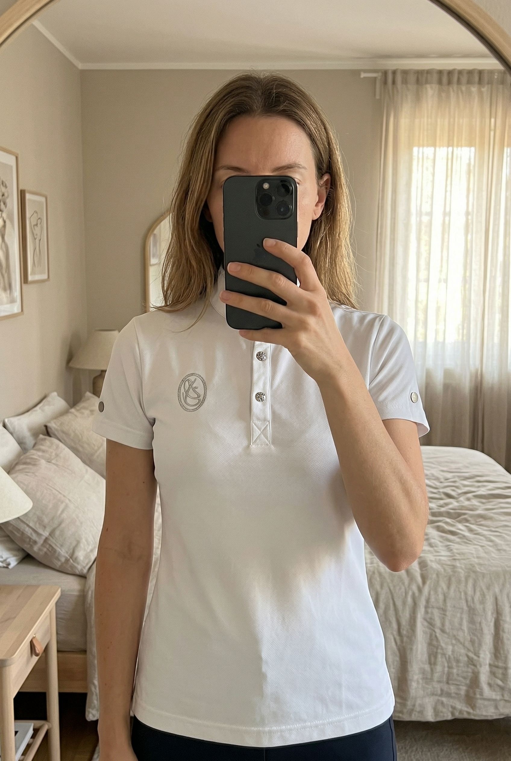 Polo de concours debout, face à la caméra, dans une chambre à la lumière douce, avec une lumière naturelle filtrant par la fenêtre.