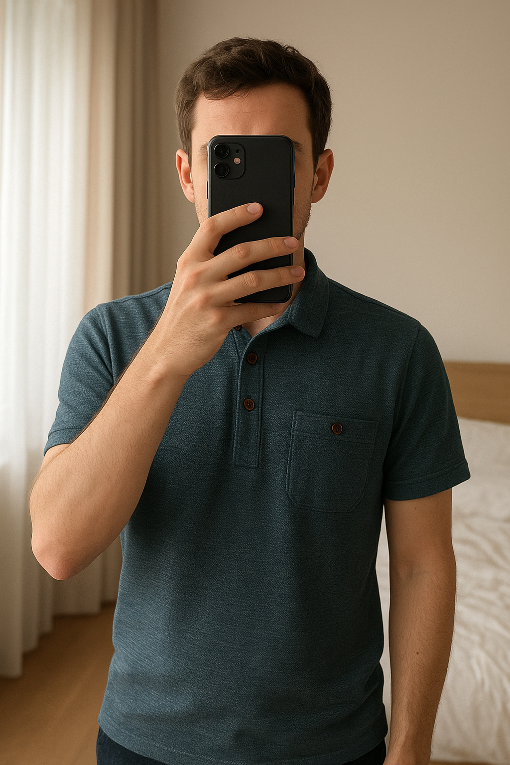Polo Farah Vintage debout, face à la caméra, dans une chambre à la lumière douce, avec une lumière naturelle filtrant par la fenêtre.