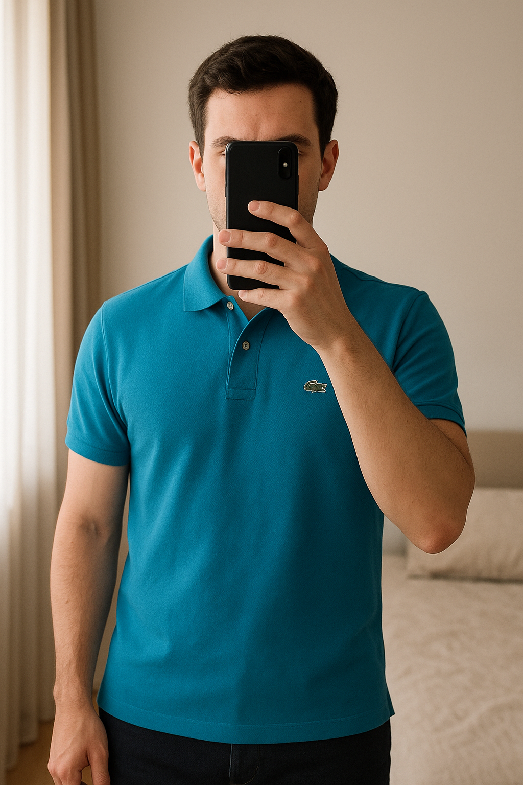 Polo Lacoste homme bleu taille M debout, face à la caméra, dans une chambre à la lumière douce, avec une lumière naturelle filtrant par la fenêtre.