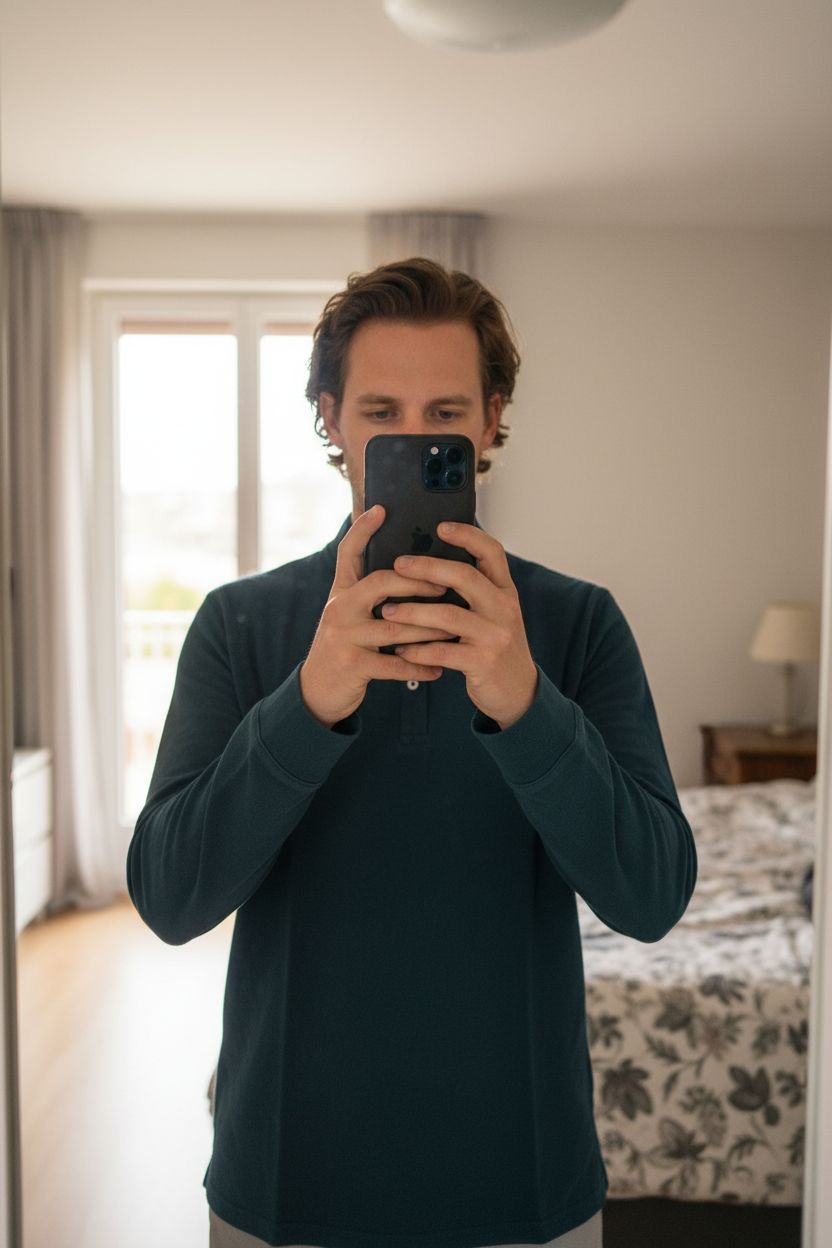 Polo à manches longues bleu debout, face à la caméra, dans une chambre à la lumière douce, avec une lumière naturelle filtrant par la fenêtre.