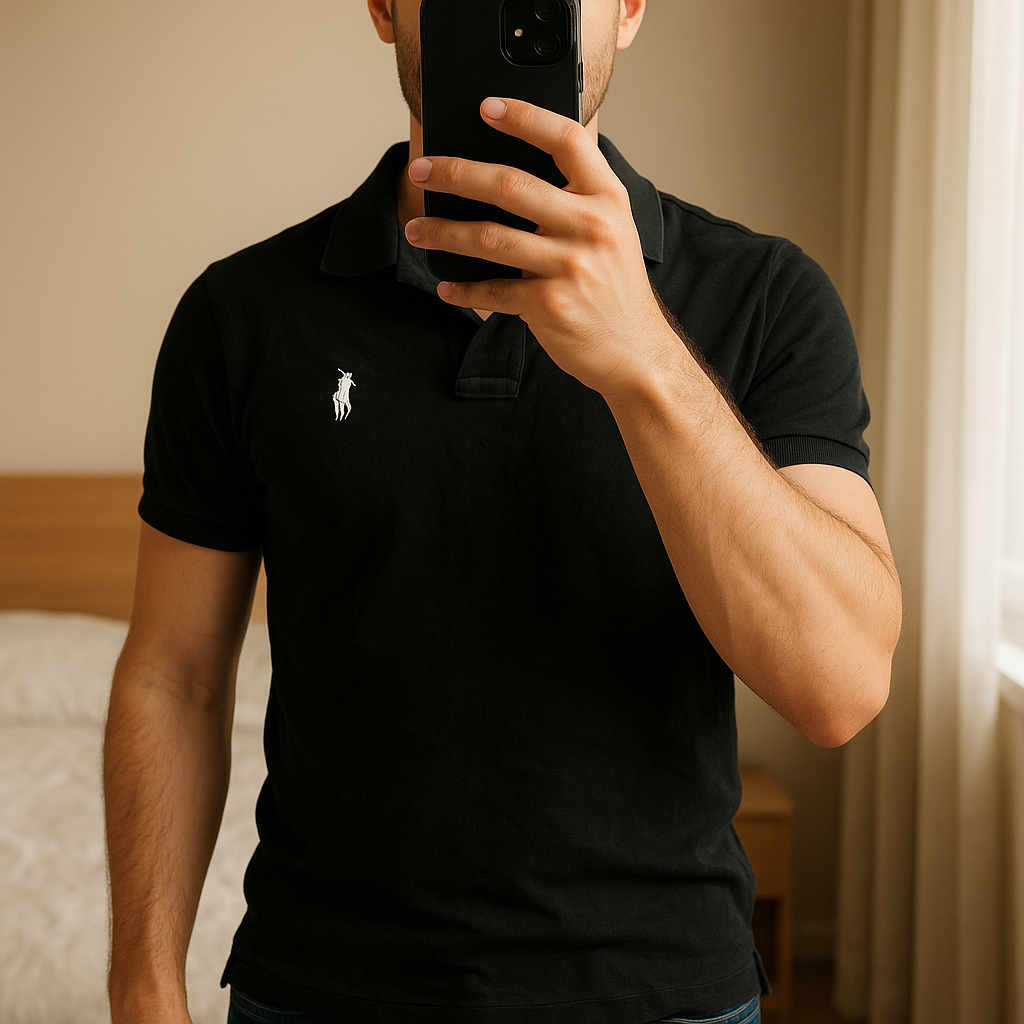 Polo Ralph Lauren noir taille S debout, face à la caméra, dans une chambre à la lumière douce, avec une lumière naturelle filtrant par la fenêtre.