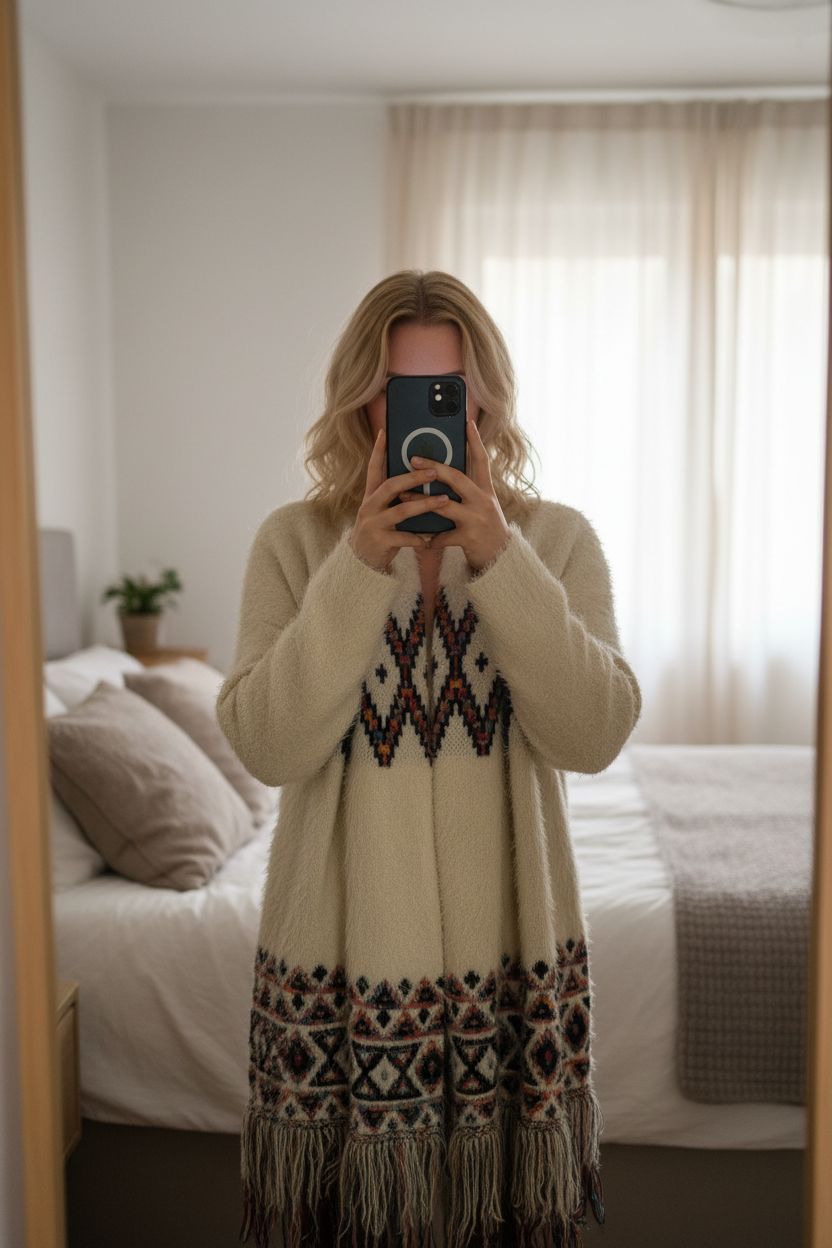 Poncho blanc et couleurs TU debout, face à la caméra, dans une chambre à la lumière douce, avec une lumière naturelle filtrant par la fenêtre.