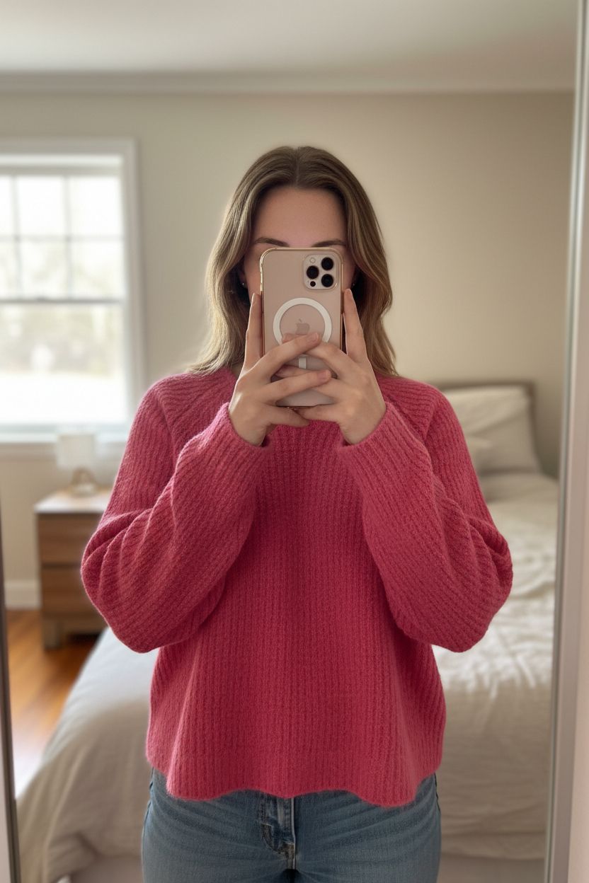 Pull american vintage taille U debout, face à la caméra, dans une chambre à la lumière douce, avec une lumière naturelle filtrant par la fenêtre.
