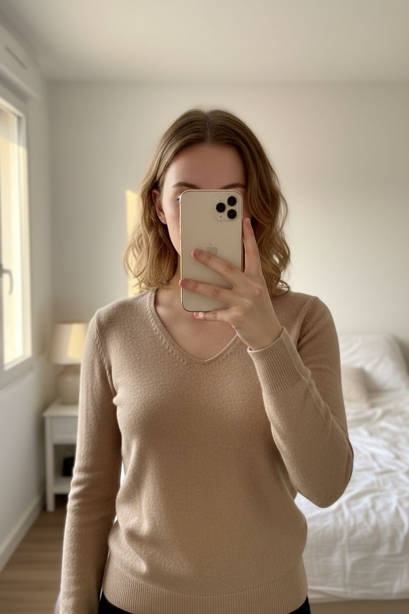 Pull beige Caroll 100% cachemire debout, face à la caméra, dans une chambre à la lumière douce, avec une lumière naturelle filtrant par la fenêtre.