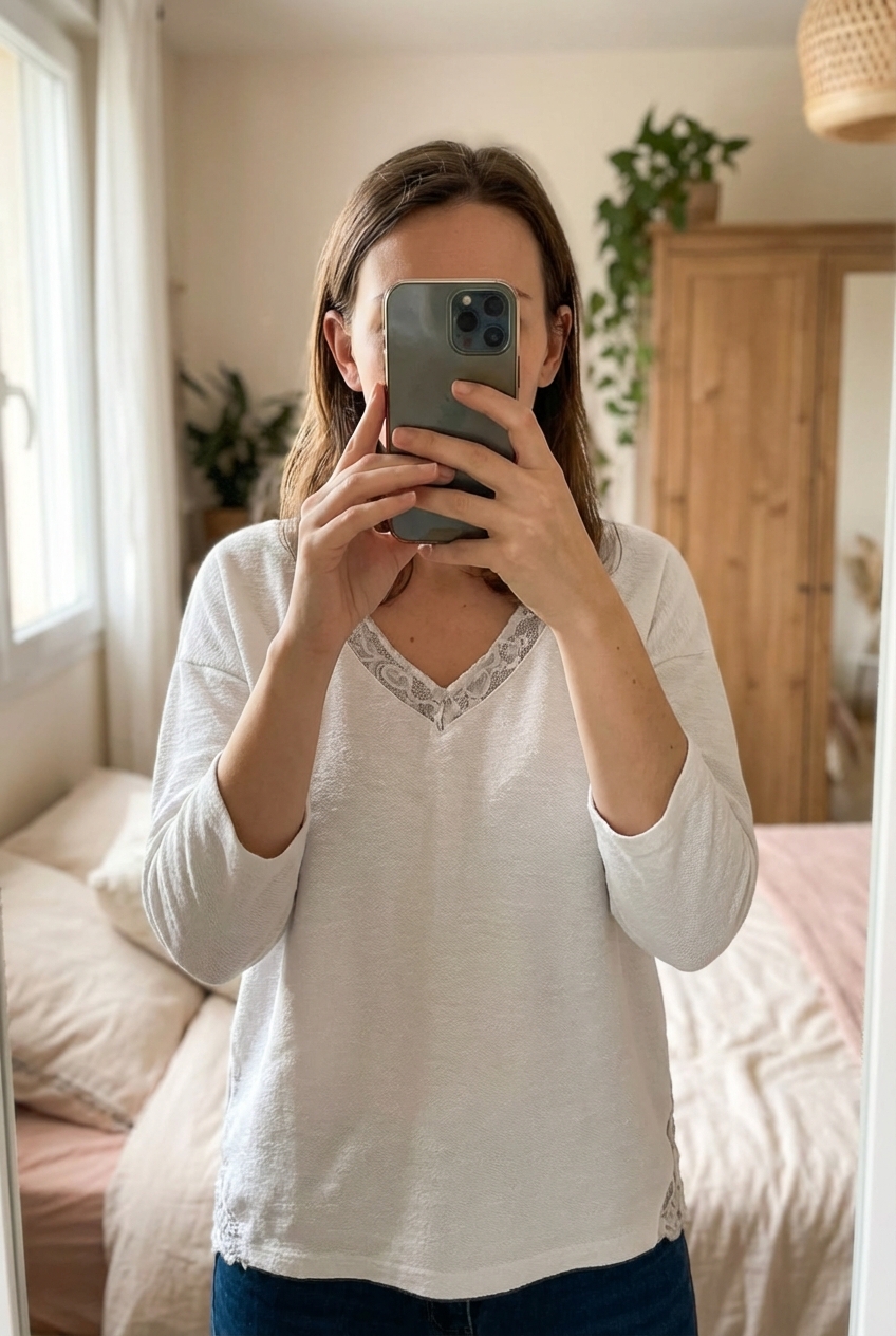 Pull blanc breal taille 40 debout, face à la caméra, dans une chambre à la lumière douce, avec une lumière naturelle filtrant par la fenêtre.