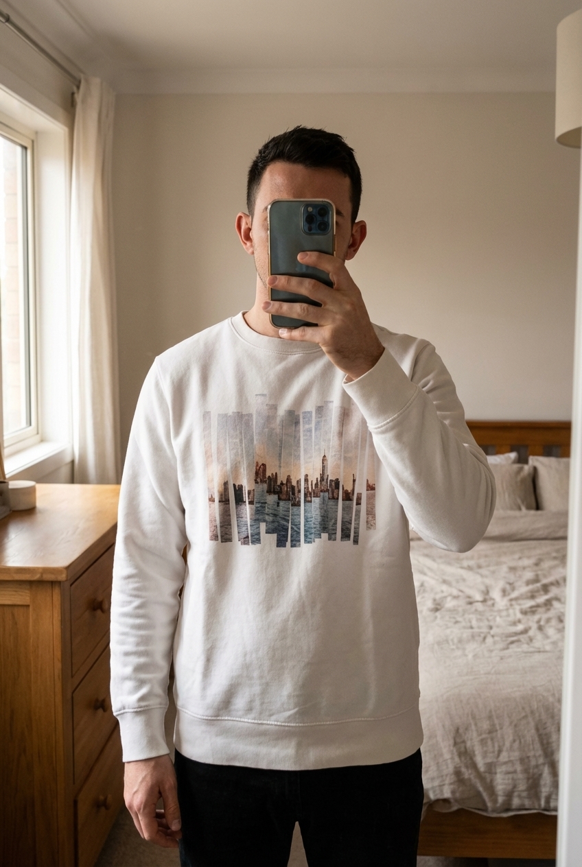Pull blanc Homme taille S debout, face à la caméra, dans une chambre à la lumière douce, avec une lumière naturelle filtrant par la fenêtre.