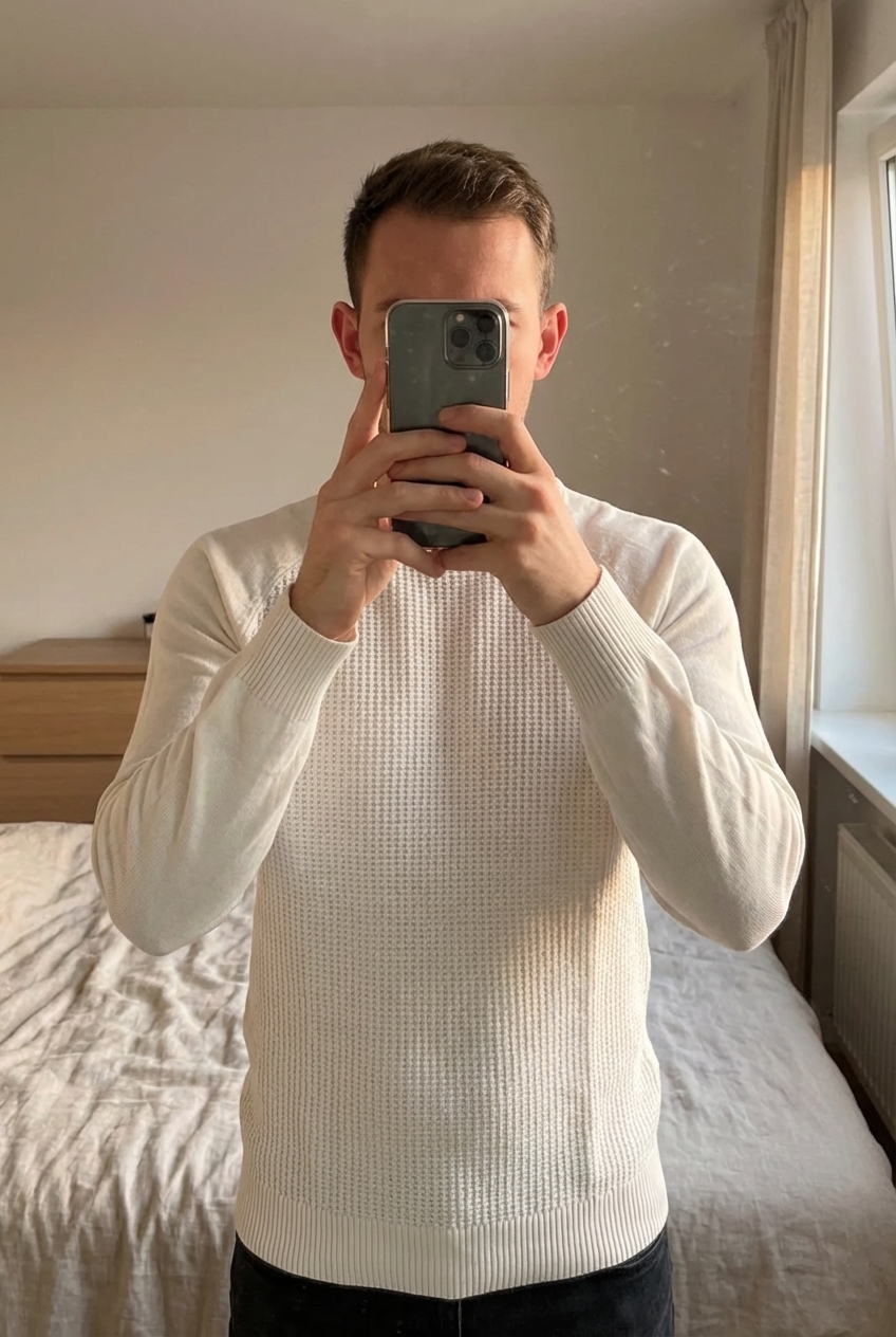 Pull blanc taille S debout, face à la caméra, dans une chambre à la lumière douce, avec une lumière naturelle filtrant par la fenêtre.