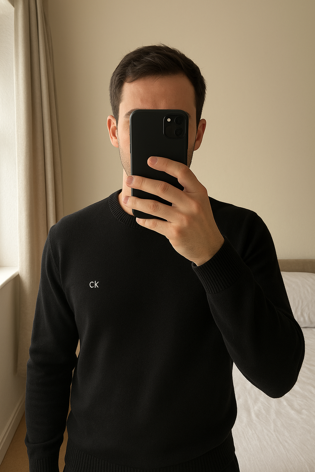 Pull Calvin Klein Jeans 🖤 debout, face à la caméra, dans une chambre à la lumière douce, avec une lumière naturelle filtrant par la fenêtre.
