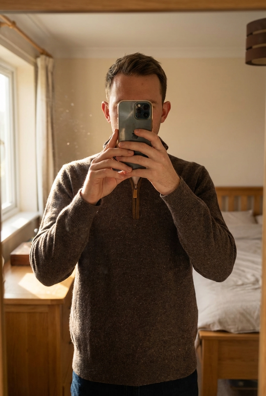 Pull camionneur homme debout, face à la caméra, dans une chambre à la lumière douce, avec une lumière naturelle filtrant par la fenêtre.