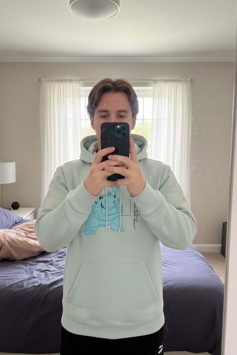 Pull à capuche Pokémon puma tortank debout, face à la caméra, dans une chambre à la lumière douce, avec une lumière naturelle filtrant par la fenêtre.