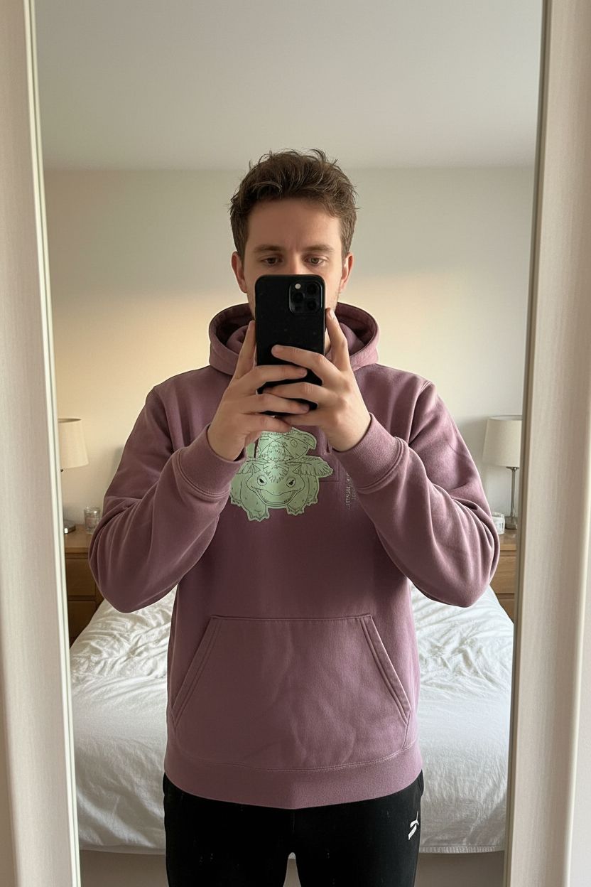 Pull à capuche puma Pokémon florizarre debout, face à la caméra, dans une chambre à la lumière douce, avec une lumière naturelle filtrant par la fenêtre.