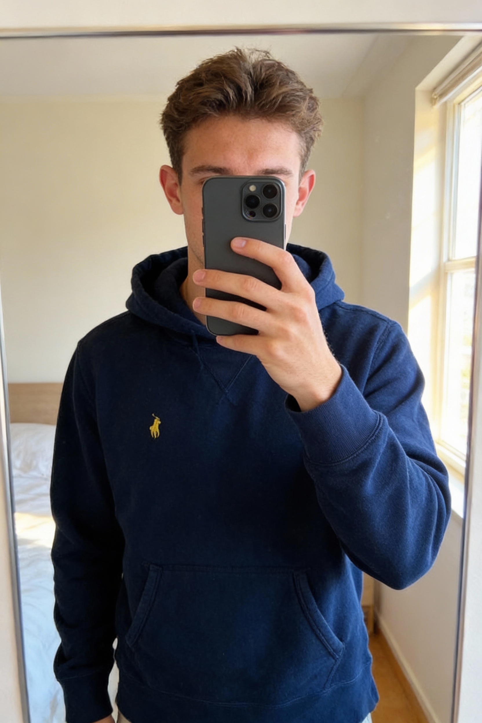 Pull à capuche Ralph Lauren marine taille S authentique debout, face à la caméra, dans une chambre à la lumière douce, avec une lumière naturelle filtrant par la fenêtre.