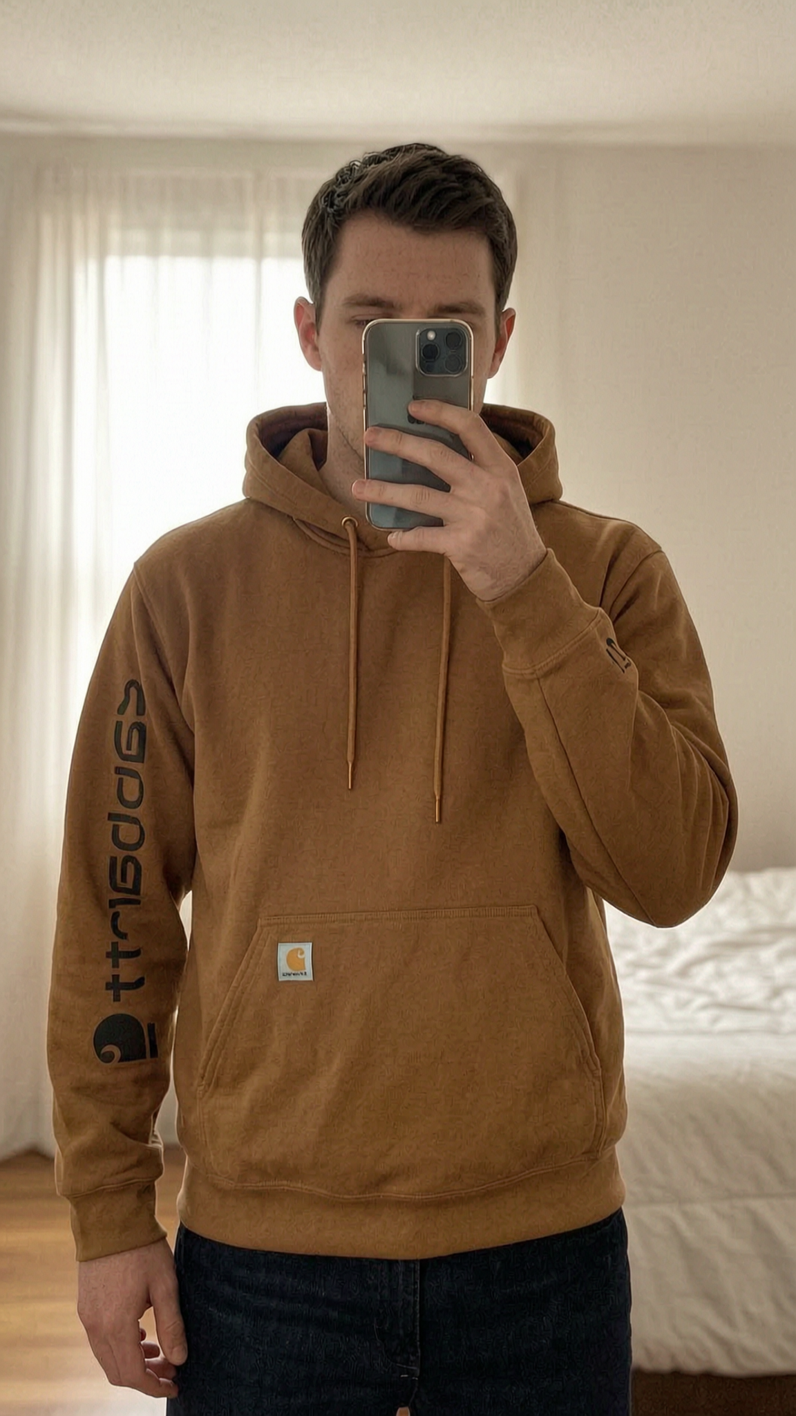 Pull Carhartt marron XS debout, face à la caméra, dans une chambre à la lumière douce, avec une lumière naturelle filtrant par la fenêtre.