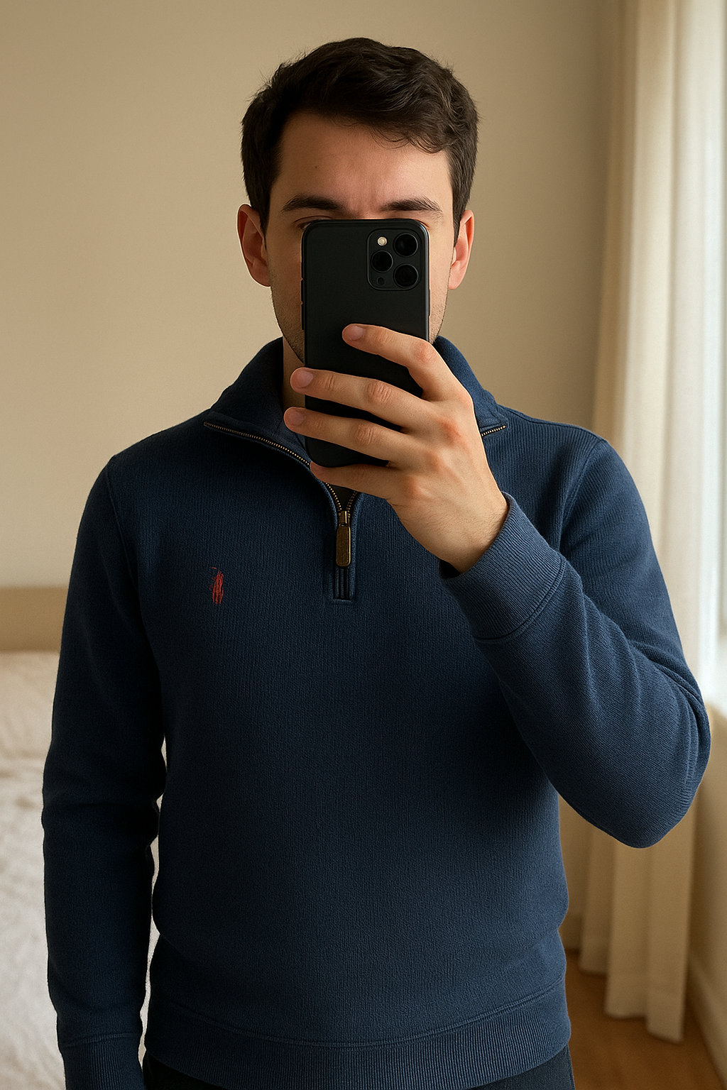 pull col camionneur half quart 1/4 zip Ralph Lauren bleu marine logo brodé – S homme – coton QZR 15 debout, face à la caméra, dans une chambre à la lumière douce, avec une lumière naturelle filtrant par la fenêtre.