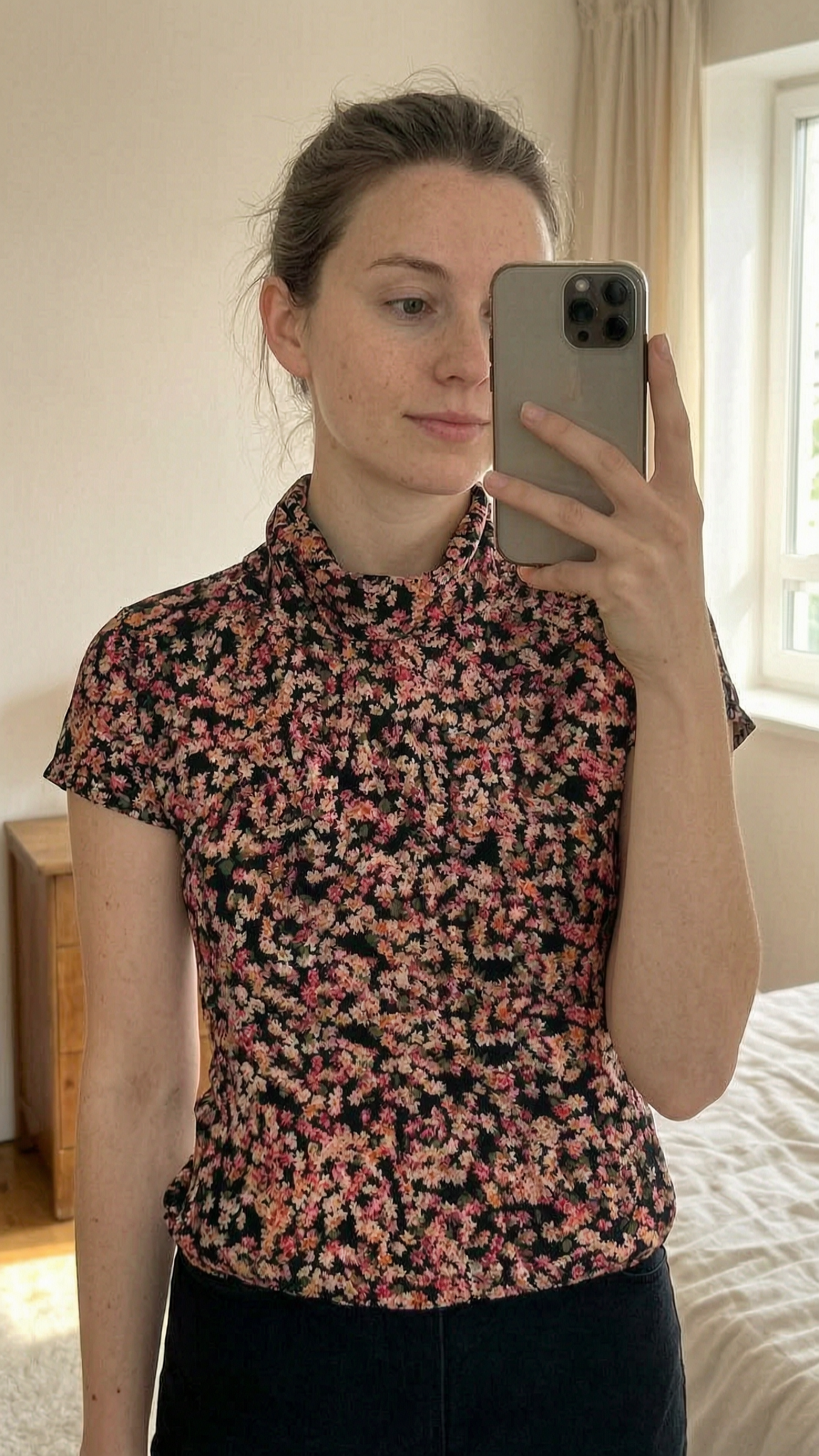 Pull à col H&M debout, face à la caméra, dans une chambre à la lumière douce, avec une lumière naturelle filtrant par la fenêtre.
