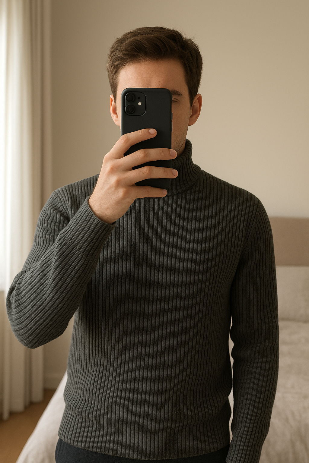 PULL col roulé noir debout, face à la caméra, dans une chambre à la lumière douce, avec une lumière naturelle filtrant par la fenêtre.