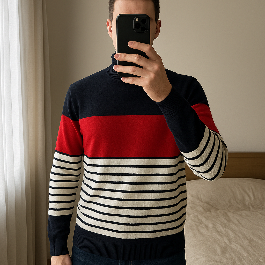 Pull col roulé Tommy Hilfiger homme M debout, face à la caméra, dans une chambre à la lumière douce, avec une lumière naturelle filtrant par la fenêtre.