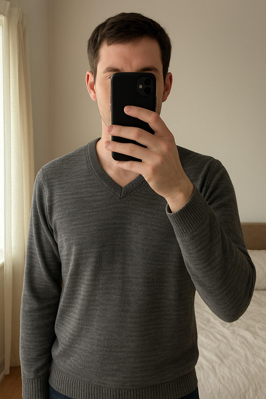 Pull col V Calvin Klein Homme taille M debout, face à la caméra, dans une chambre à la lumière douce, avec une lumière naturelle filtrant par la fenêtre.